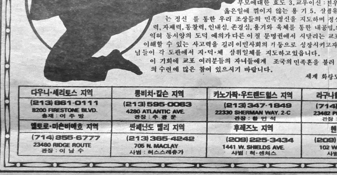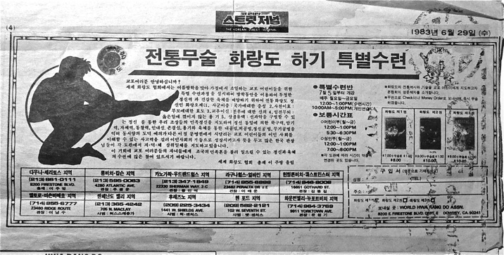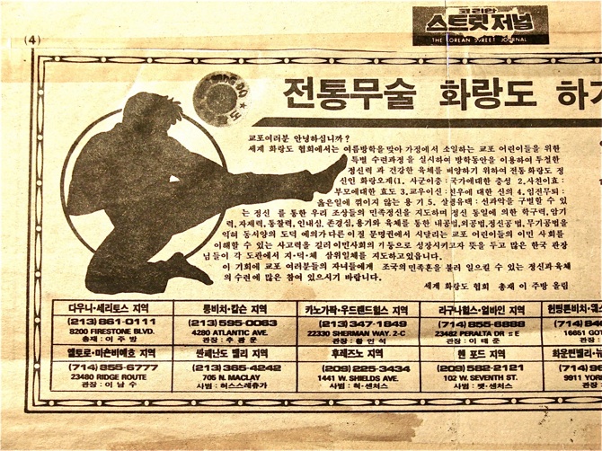 Ad in Los Angeles Korean newspaper promoting all the Hwarang Dojangs under the auspices of Supreme Grand Master, Jo Bang Lee. San Fernando Dojang on Maclay Street is listed on the bottom row, second to the left.