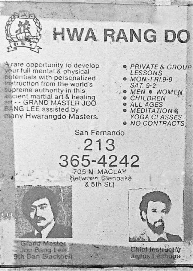 Old flyer promoting the San Fernando Hwarangdo Dojang at 705 N. Maclay Street, opened under the auspices of Supreme Grandmaster Jo Bang Lee and featuring Jesse Lechuga as Chief Instructor.