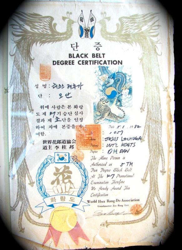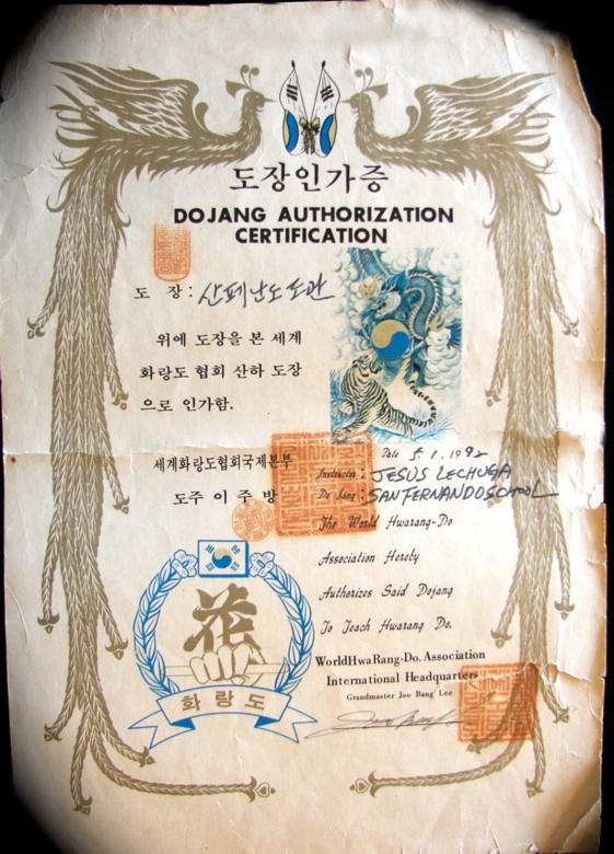 Jess Lechuga’s San Fernando Dojang Certification signed by Supreme Grand Master, Jo Bang Lee, World Hwarang Do Association International Headquarters