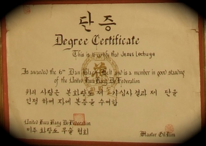 6th Dan Black Belt issued to Master Instructor Lechuga by Master Gil Kim of the United Hwa Rang Do Federation