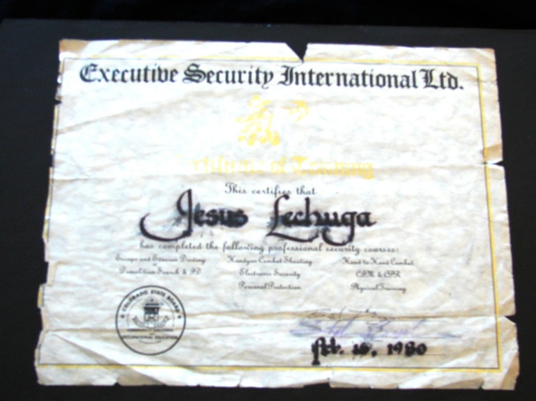 This certificate attests to Master Instructor Lechuga’s training in additional security related skills including handgun combat shooting, This certificate was issued to Master Instructor Lechuga by Bob Dugan who is Founder, President and Manager of Training at Executive Security International. It was issued in 1980 when ESI first opened.